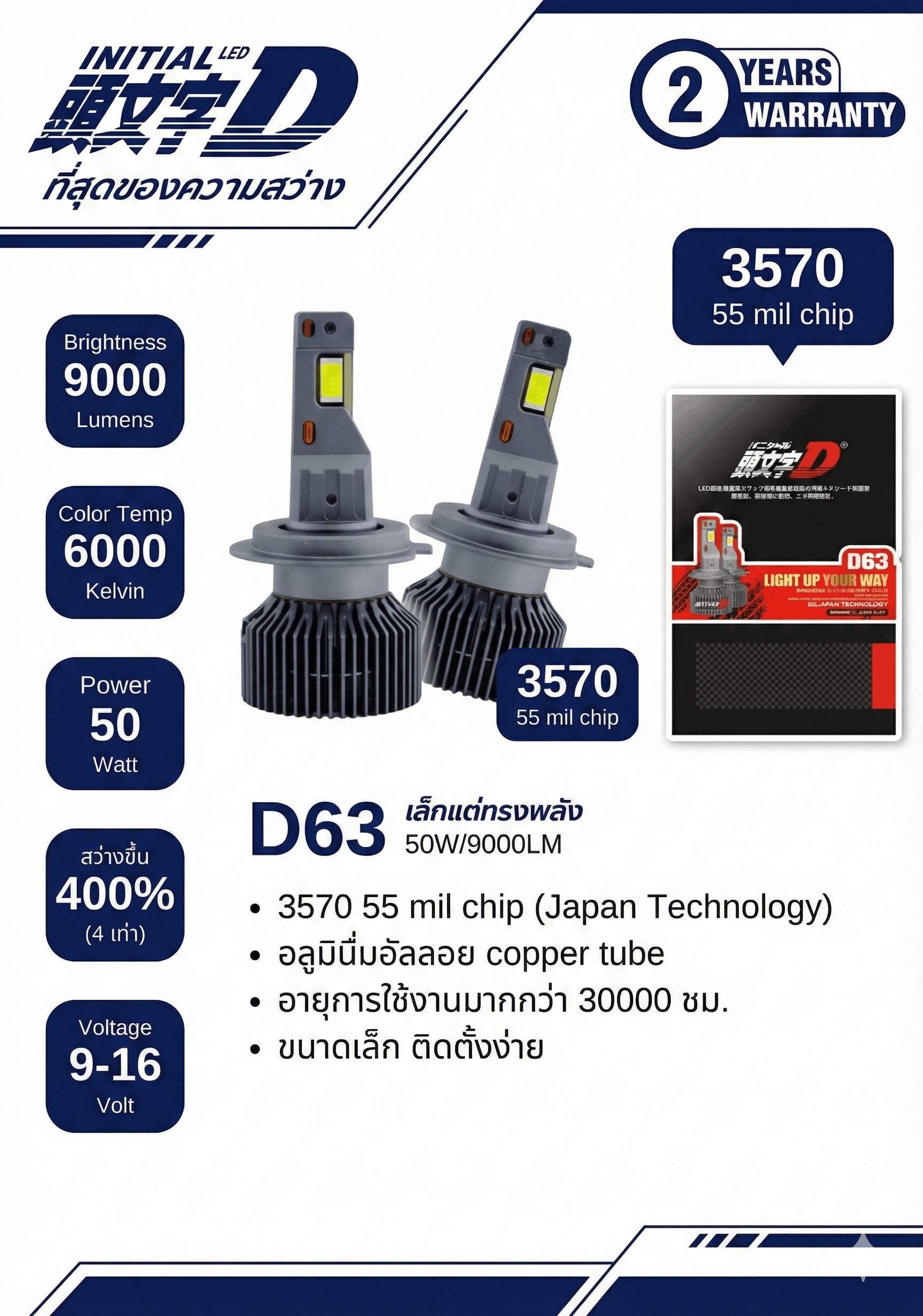 หลอดไฟหน้า LED รุ่น D63 (Premium Performance) - เล็กพริกขี้หนู สว่างจัด 400%